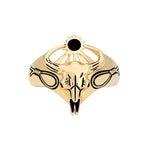 Bull skulls symbolize courage, toughness, and agility. This detailed ring depicts a bull skull between two lassos, under a blazing black sun. Finely crafted in .925 Sterling Silver.
