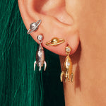 A rocket launched from the surface of the Earth needs to reach a speed of at least 4.9 miles per second in order to get into orbit. This speed is known as the orbital velocity and corresponds to more than 20 times the speed of sound. To escape Earth’s gravity and travel to the Moon or another planet, it would need to go even faster at a speed of 7 miles per second or about 25,000 miles per hour. You’ll look out of this world in these dangly, sweet little rocket stud earrings.